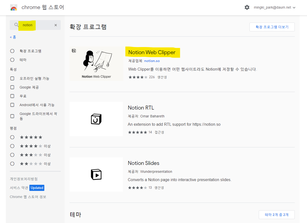 2.2 스토어 검색 창에서 'notion'으로 검색하면 다음과 같은 확장 프로그램 목록이 나타난다. 여기서 Notion Web Clipper를 찾아 Chrome에 추가 버튼을 클릭하고 설치한다.
