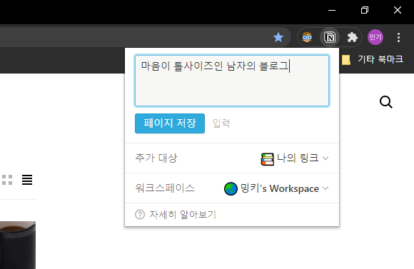3.2 사용자 편의에 맞게 클리핑 옵션을 설정할 수 있는 팝업이 나타난다. 팝업 상단에는 해당 자료를 저장할 페이지 이름을 지정할 수 있고, 추가 대상에서는 저장할 방법 및 상위 페이지를 선택할 수 있다. 사용 중인 작업공간이 여러 개라면 워크스페이스에서 선택할 수 있다.
